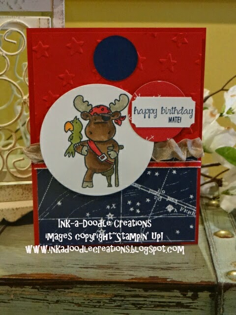 I decided to stick to the sketch only with my challenge card and turn it into a fun kids birthday card. I was given this cute little moose pirate stamp by a friend and I hadn't used it yet, so I pulled it and went to work. I paired it with the maritime DSP and added some fun circles and ribbon.